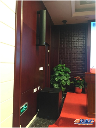 该项目中活动中心主扩扬声器采用了两只可调指向音箱壁挂的安装方式,因此为了保证声场均匀度达到厅堂扩声系统声学特性指标中的国家规定,天创技术人员在调试过程中对两只音箱进行了仔细的调整,将音箱指向调整到可以最佳,使得声音可以均匀的覆盖,另外对六只后场吸顶音箱加以延时、音量等处理,避免了声像不统一的问题。在音箱的功放分配上,首先将2只返送音箱和2只低音音箱分别接到一台功放输出,其次在6只吸顶音箱的并联分配上,考虑到吸顶音箱与主扩音箱在听音区会由于相对距离的原因而产生延时,技术人员将与主扩音箱距离相同的每2只吸顶音箱并接成1路输出,从而可以在处理器内对补声音箱进行延时的修正,最终达到良好的会议效果。
