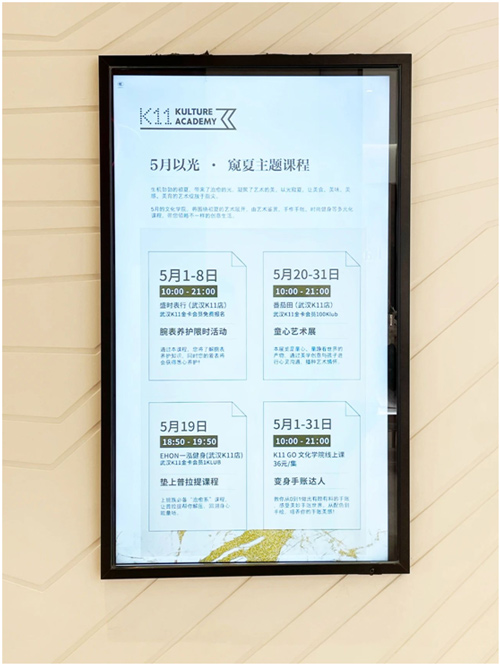 对于商场来说,想获得更多的客流,除了自身品牌价值等因素外,商场内的风格布局、店招宣传至关重要。一座设计风格独特、兼具良好信息化展示的商场,往往能够为商场带来更多的销量。汉口新世界K11商场内部,通过安装于各公共区域的飞利浦数字标牌,为顾客带来富有视觉冲击感的信息化智慧展示。