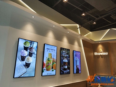 SHARETEA冠捷店为了方便顾客等候和取用饮料,在店内的安装的信发系统+叫号系统采用了11台飞利浦商用液晶显示器49BDL4050D,其中,在点购饮料台上水平安装了3台,店内两处墙体分别两组4台一排的液晶显示49BDL4050D。