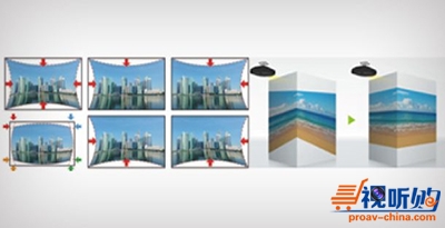 内置多种几何校正功能,在进行折角墙、曲面、球面或其他类型屏幕投射时可以实现精准的画面投影,不需要外接其他任何设备就可以满足各种投影场所的多样化安装需求。