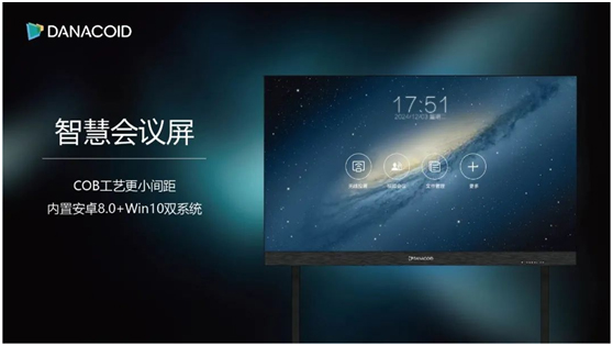会议中使用的DANACOID LED智慧会议屏内置安卓8.0+WIN10双系统,一键切换,兼容所有视频软件系统,随时开启会议;极简硬件设计,超薄箱体,无机柜理念;点间距0.9毫米,准4K超高清显示,身临其境;全倒装COB工艺,超级防护,防蓝光,防水防潮,防磕碰,可以水洗;一键开关,遥控操作,应用更简单;一键传屏,快速开启高效会议;可配智慧桌插,保证高效会议的同时也让会议更加安全;直通分布式,联通所有音视频;完善的会议生态产品,丰富会议体验。