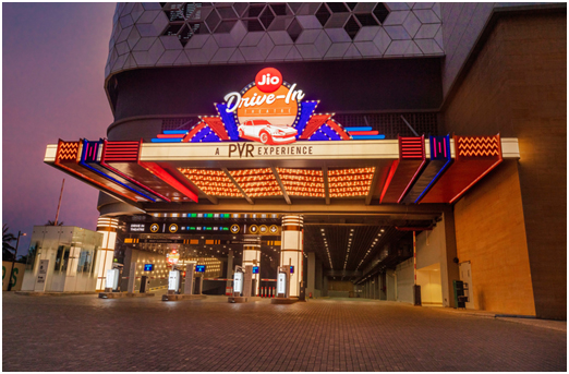 这家免下车剧院位于孟买新兴金融中心Bandra Kurla Complex,设在Reliance Industries开发的市中心高档零售商场Jio World Drive的顶层平台。免下车剧院持前卫的观影理念,可容纳290辆汽车,采用先进的放映技术。剧院配有一块25.5米宽的巨型银幕,而电影音频是通过汽车的音响系统接收调频信号来播放的。