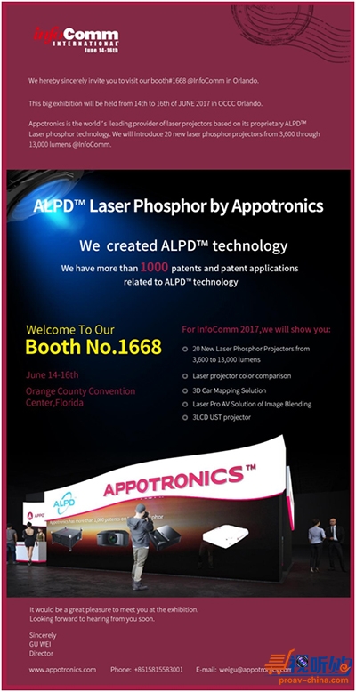 2017年6月14-16日,一年一度的全球盛会美国InfoComm展即将于奥兰多橙郡国际会展中心拉开帷幕,美国InfoComm展是世界上最大的专业数字信息技术与解决方案及会议系统行业的贸易类展会,是一场集娱乐技术、投影与显示、数字告示系统、多点触控等领域国际新技术及流行趋势的高端汇演。光峰,携最强激光显示产品线及多样产品解决方案,强势登陆InfoComm USA 2017。欢迎光临光峰展位:1668,见证激光显示前沿技术。