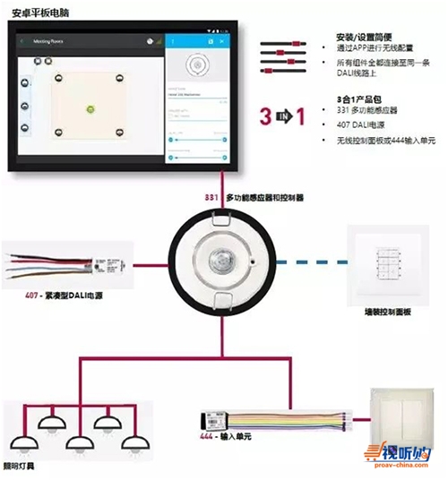RoomSet系统的安装和配置已经不能再快捷和简单了。331多功能感应器和控制器构成安装的核心。现有全部DALI组件相互之间保持连通,同时也与331感应器连接。感应器可通过蓝牙无线连接到一款操作简便的APP上。连通后,DALI组件可完全通过这款APP进行配置,这意味着您可以在几分钟内完成对灯具的分组以及向控制面板的功能进行分配。