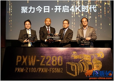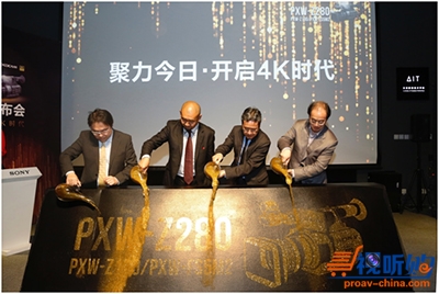 索尼中国专业系统集团总裁本野桂,索尼专业系统集团业务二部首席设计师星野弘美、索尼中国专业系统集团创新业务开发本部总监冈田修司、中国电影电视技术学会(CSMPTE)摄影摄像专业委员会主任杨寅上台为索尼PXW-Z280新品亮相揭幕,现场气氛一度达到高潮。