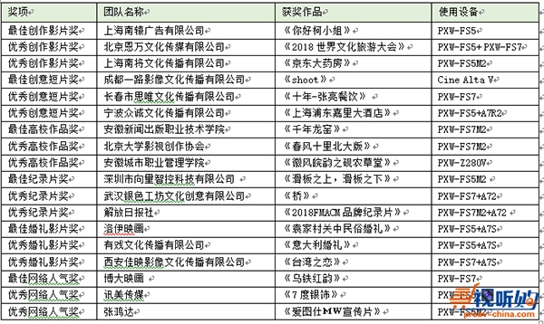 本次影像大赛入围的40部作品共参与到六大类奖项的角逐中,分别为创作影片奖、纪录片奖、高校作品奖、创意短片奖、婚礼影片奖和网络人气奖。每一大类奖项都评选出了一部最佳获奖作品和两部优秀获奖作品。获奖团队同时还获得了由索尼中国专业系统集团提供的PXW-FS7M2、PXW-FS5M2、PXW- Z280V、PXW-Z90V 等专业摄像机产品,以及爱图仕、ATOMOS、富士等提供的其他拍摄设备奖品,以此鼓励影像工作者持续使用索尼专业设备拍摄更多精彩的影片。