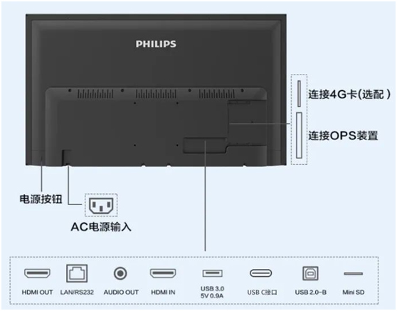 使用会议平板时常避免不了需要接驳各类设备,比如说笔记本电脑、外置音箱等等,这往往与使用场景以及用户需求相关。考虑到接口的重要性,飞利浦智能会议平板配备了丰富的接口,如 HDMI OUT、 HDMI IN 、Mini SD、RS232、USB等接口,此外更有USB-C全功能接口,可实现视频/文字等数据快速传输以及移动设备的反向充电,具备强大的可拓展性及灵活性,有效提高办公生产力!