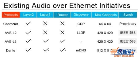 对比COBRONET、AVB-L2、AVB-L3三种协议,DANTE协议应用在音频上优势显而易见。