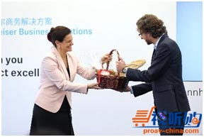 北京德国中心董事总经理 Ruth Schimanowski女士为森海塞尔全球 CEO Daniel Sennheiser先生送上面包篮,对森海塞尔迁入北京德国中心表示祝福。