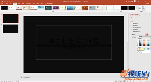 首先打开PPT软件,点击添加第一张幻灯片。幻灯片默认为白色背景,首先需要把它设置为黑色,这样才可以在切换台或者编辑软件中配合Luma Key实现字幕效果。选择[设计],点击黑色背景的幻灯片模版即可完成,如果设计中没有对应的模版,只需要点击后方的设置背景格式,在纯色填充的模式下将颜色改为黑色并点击应用到全部。注意要将PPT大小设置为16:9。