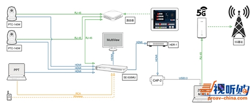 再次,将HDR-1录制信号输入到洋铭的HDMI信号采集盒CAP-2当中,进行信号采集,进入会议互动或者是一些直播软件,最后实现网络播出。