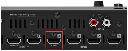 Plus输入4增加了SCALER功能,之前Roland几个型号也说过,标注有SCALER,就证明这路接口输入信号可以对画面的大小位置进行任意缩放裁切以适应显示需求。同样1HD的4个输入口也是没有的。