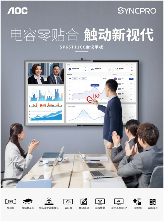 正是由于在显示行业的多年耕耘,AOC已经全面覆盖主要显示技术门类和需求场景,出货体量巨大。借助其在商显应用行业的专业用户的尝试需求洞察,SYNCPRO此次全面布局会议,发布的全新电容屏卓越版 SP65T11CC智能会议平板,拥有电容零贴合、隐私保护式摄像头、云白板、无线传屏、显示系统双4K等先进的工艺和丰富功能,并植入了强大的独立处理器、Type-C接口和安卓、Windows双系统,兼具高效率、稳定性和广泛兼容扩展性。