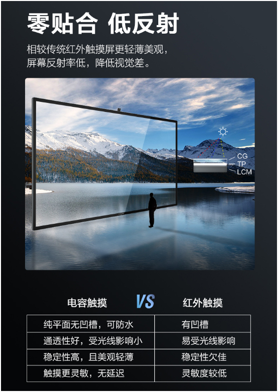 目前,会议室中依旧有大量的红外线技术触摸屏,受技术原理所限,红外屏不论从外观、触摸手感还是准确度来看,都远逊于电容式触摸屏。红外屏需要在屏幕四周设计凸起的红外边框,无法设计为平面,而且易受水或汗渍影响、怕污垢,特别是易受外来红外光源影响。
