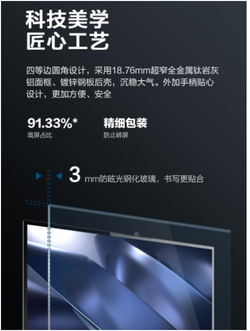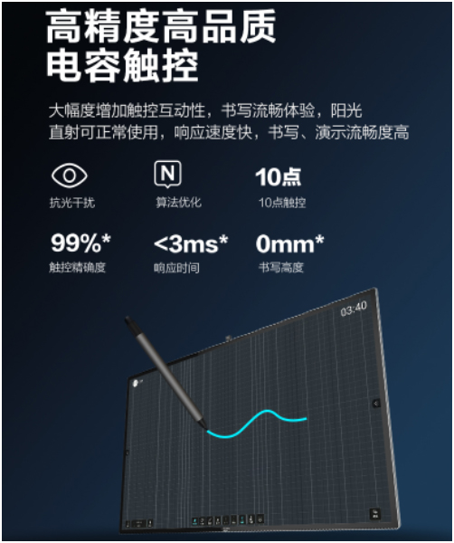 正是采用了行业领先的电容屏触控技术,65英寸的SYNCPRO卓越版 SP65T11CC智能会议平板实现了优秀的全面屏设计,其屏占比高达91.33%,达到了行业顶级产品85英寸的屏占比水准。在实际触控体验上,SYNCPRO卓越版 SP65T11CC智能会议平板的触控精准度达到了99%,加上3mm防眩光钢化玻璃,完全无须担心高亮室外光线干扰到触控操作。另外,这块电容屏的灵敏度表现也相当优秀,可以做到点到即至,整个触控过程的响应速度控制在3ms以内。