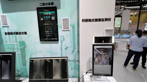 智慧医疗区域则展示智慧门诊、智慧病房两大显示方案。其中,冠捷科技集团始终贯彻、践行企业社会责任,创新性推出非接触式健康监测仪产品,该产品通过简单、无痛扫描,快速获得体温、心率、血氧浓度等数据,有利于医疗措施的迅速部署,提升公共卫生防控救治能力。
