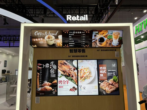 展会现场集中展示了奶茶餐饮、商超连锁、零售橱窗等应用场景,备受现场专业观众瞩目。奶茶餐饮场景中,具备高清高亮、四等边微边框设计数字标牌令人眼前一亮,搭配CMS信发系统,实现多联屏云拼接时,画面展示更完整,视觉效果更震撼;智慧餐牌时尚简约,可根据日常活动排期进行门店上市/促销等活动推广及展示。
