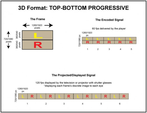 例如对于1920×1080 60fps的视频源,对每一帧画面都拆分成2个1920×540画面。投影仪或监视器等设备接收到3D视频后,将其转换为针对左右眼睛的单独帧,如下图所示。