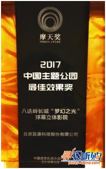 3月17日,中国游乐行业第四届“摩天奖”颁奖盛典于北京国家会议中心揭幕。赢康凭借八达岭长城“梦幻之光”球幕立体影院项目获得了“中国主题公园最佳效果奖”。