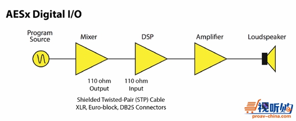 和模拟相似,AESx是输出和输入之间的单向连接。AESx允许使用平衡式模拟电缆和接头,大多采用带XLR公头输出驱动和XLR母头输入的屏蔽双绞线。电缆较短时(< 30 m),同一根电缆也可用于平衡式模拟接口。专为数字I/O而设计的低电容电缆可以延长到100 m。因为场地规格不同,布线的长度也会有差异。还有其它的电缆选项,如同轴线(AES3id ——其实就是一种视频接口)以及类电缆(如超5类电缆)。AESx标准也适用于使用小体积DB25接头的多对线(多达16个通道)。具体采用哪种电缆取决于不同产品,并且相互转换时会相应使用不同的方法。制造商会根据产品的目标市场决定具体规格。