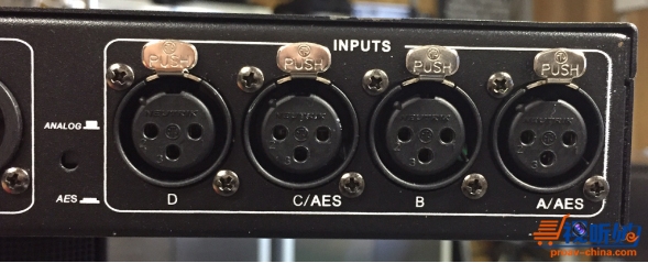 图4 –四进AESx处理器的输入接头。注意,一个路模拟连接需要一个XLR,但是四个AESx通道只需要两个XLR(每个接头连接两个通道)。可通过开关切换选择模拟和AES。