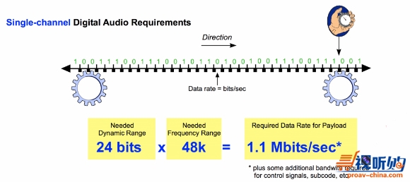 模拟信号数字化的目标是无损编码。要实现这个目标,采样率必须为模拟信号带宽的2倍以上,动态范围必须接近100dB。所以,数据的主要属性是位深和采样率。多数设备都默认设置“24/48”,意思是位深为24比特,采样率为48 kHz。还有更高的采样率,并且某些应用场景也会使用更高的采样率。