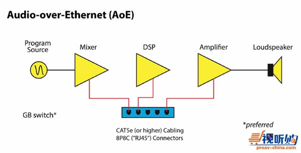 音频从业人员必须掌握所使用的AoE“种类”的规格。包括,通过个人电脑的控制应用为QoS分配音频信号,分配网络交换机。