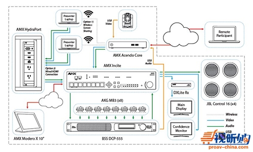 哈曼通过完整的会议解决方案可以用最简单的操作、最先进的技术完成大型会议室部署。AMX Acendo Core可以让用户轻松连接到任何网络会议平台而不必携带移动设备,AMX Incite提供视频转换和配送功能,音频通过BSS DCP-555配送,实现麦克风混音及声场回音消除(AEC),然后通过AMX Incite返回,由内置的Crown DriveCore功放稍加处理,再通过JBL扬声器输出,Incite机载的NetLinx NX控制器提供控制功能。