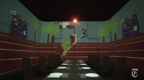 投影投射在空间的每一面墙壁和餐桌上,投影的物体大小和形状会受到餐盘的影响。当将碗碟放在桌子上时,碗碟所包含的风景画面就会散发到桌面和四周。
