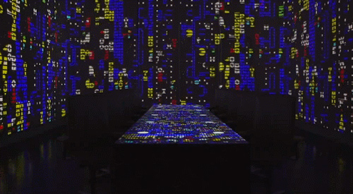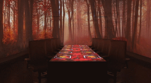 位于这个高耸白色空间的正中央,是一种类似“会议室”的摆设——一个巨大的白色长桌和10张白色工作椅。头顶上,有7部投影机和一系列镁光灯,空气中散发着某些未知香料的味道,这一切,都活似一个拍摄未来风格电影的制片厂。