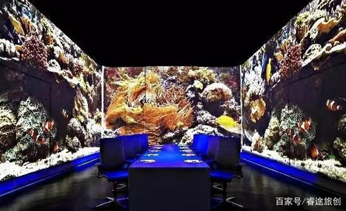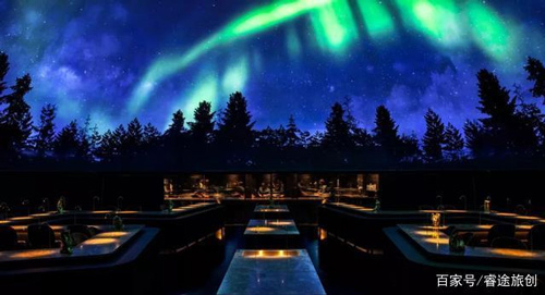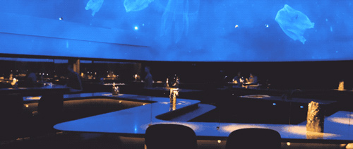 穿过二楼堆满酒的玻璃酒窖,就进入到最让人惊叹的餐厅部分。整个餐厅的灯光设计让氛围显得非常迷幻。一进入餐厅,就会被眼前的景色所惊叹,充满萤火虫的森林美景,北极夜空中出现的极光,游动着水母的深蓝色海洋……