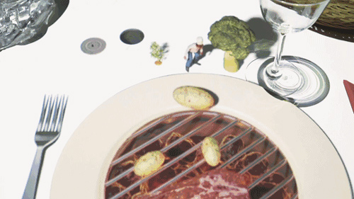 《烤牛排》厨师从下水道爬上来后,往烤炉里添油、点火,给肉翻身,赶苍蝇,结果不慎将油桶掉落进烤炉,被烟熏得迷迷糊糊的小厨师最后又掉进了自己爬上来的那个下水道里。