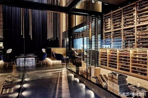 通过画廊空间的升降门,就可以去往餐厅的内部一层。一层是一个宽敞的酒吧区,这个房间足足有 14 米高,一边是三层高的玻璃酒窖,装了超过一万瓶酒。