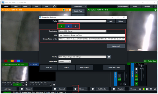 在vMix软件中添加需要推流的“Program”画面,点击软件界面下方“Stream”左侧设置按钮,在弹出的设置页面中可以设置3个平台同时推流直播,将直播平台所提供的RTMP URL地址和密钥复制并粘贴到软件中即可。