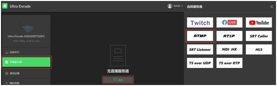 Stream/Encode系列编码盒Web GUI,进入“直播服务器”页签。点击“添加”,选择“RTMP”。