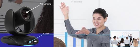 AVer CAM550具备多项创新的 AI 功能,其中最新的智能画廊(Smart Gallery)功能,应用 AI 技术,框选每个与会者呈现相同尺寸,以大头照或半身模式捕捉与会者的表情与姿态,带来更自然的视频会议体验;另外,整合第三方麦克风如 Shure® 和 Sennheiser®,即可拥有声音追踪的功能。