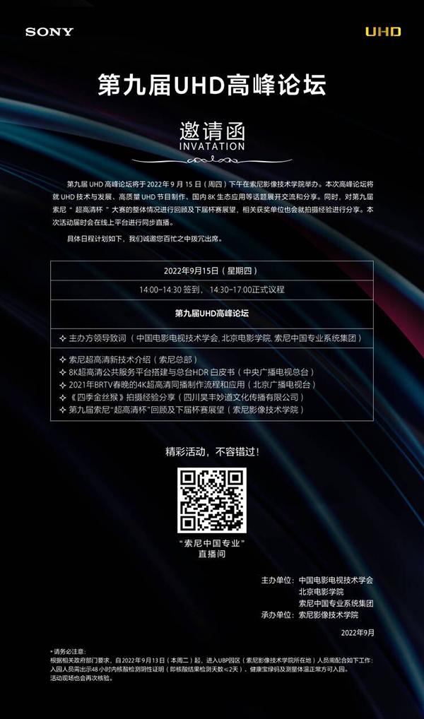 第九届UHD高峰论坛将于2022年9月15日(周四)下午在索尼影像技术学院举办。本次高峰论坛将就UHD技术与发展、高质量UHD节目制作、国内8K生态应用等话题展开交流和分享。同时,对第九届索尼“超高清杯”大赛的整体情况进行回顾及下届杯赛展望,相关获奖单位也会就拍摄经验进行分享。本次活动届时会在线上平台进行同步直播。