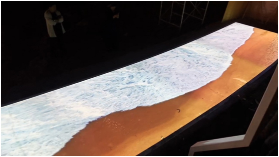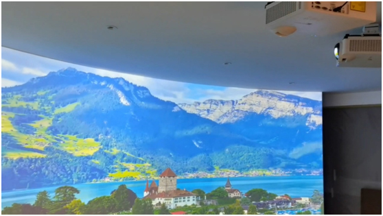 哈尔滨旅游学院展厅——9台Venus系列高亮短焦投影机通过拼接融合,打造270°沉浸式展厅,配合画面内容,让观众近距离感受画面带来的冲击力。