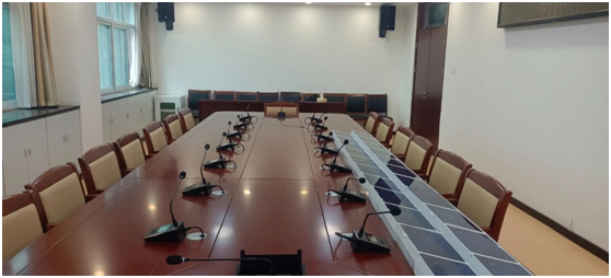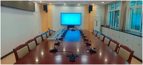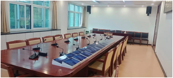会议室搭配着讯谷数字会议系统,手拉手话筒,根据会场的空间布局,设计搭配专业音箱、功放、数字音频处理器使用,在保证声音清晰地辐射整个会议室的同时,解决了传统会议扩声系统声压级不均匀、语言清晰度差的问题,满足现场会议扩声的使用需求。