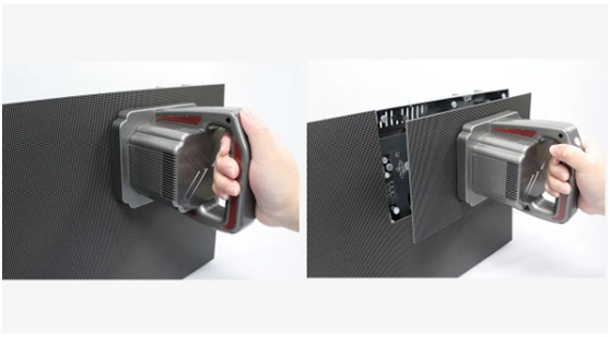 传统的后维护需要在屏幕背面留出足够位置的维修通道,对施工空间的要求较高,导致在一定程度上压缩可视空间。起初前维护仅仅只针对模组前维护,而现在的完全前维护是模组、电源、控制卡均可以前装前卸,箱体背后无需留有维修通道,大幅减少了维护成本和工作量,同时让小间距LED轻薄的优势可以淋漓尽致的体现。