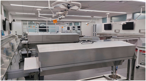 两间可合并式解剖实验室内共设有 16 个解剖工作站。各工作站上方的摄像机可采集解剖过程细节,前方的 86" 平板显示器则可显示其采集的画面内容。NAV® Pro AVoIP 系统可将来自任一工作站的视频画面共享至单个或所有工作站的显示器,包括额外加装的 4 台 43" 显示器和两边实验室的教师工作站。各小组同学无需围绕在工作台周围,即可清晰地观摩解剖细节画面。