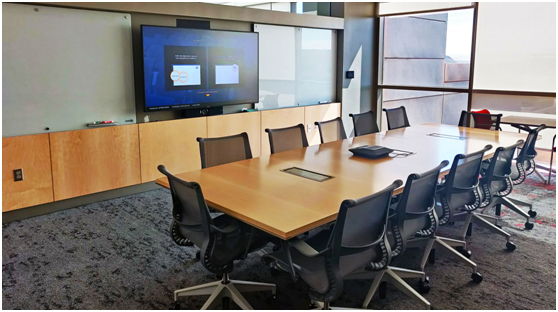 院长会议室:5 层的院长会议室在保持与其他会议室相同系统部署的基础上,将显示器尺寸升级至 86",并加装 UC 摄像机、麦克风及视频编解码器,用于视频会议。