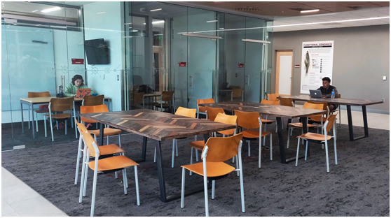自习室:8 间小型自习室位于 3-5 层的学生休息区附近。室内配备的 HC 402 会议协作系统可方便大家交流协作。演示者只需将笔记本电脑接入 HC 402 系统墙面板的 HDMI 接口,即可启动 AV 系统,并将内容共享至 43" 平板显示器。房间无人时,AV 系统可自动关闭。