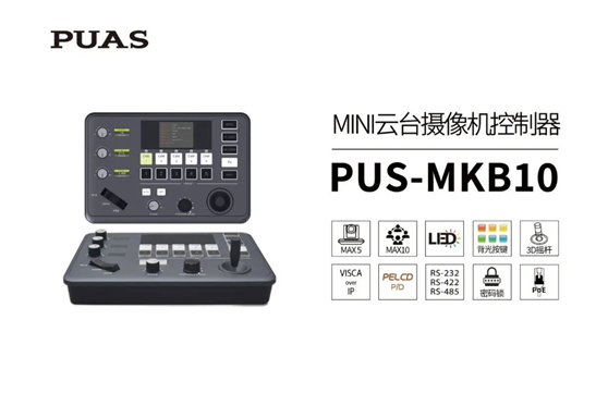 PUS-MKB10是一款迷你云台摄像机控制器,净重仅1.1kg。小身材但蕴含大能量,MKB10可同时控制最多5台摄像机,设置最多10个预置位,7级云台和变焦速度调节,充分满足用户不同场景变焦、切屏需求。