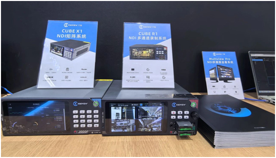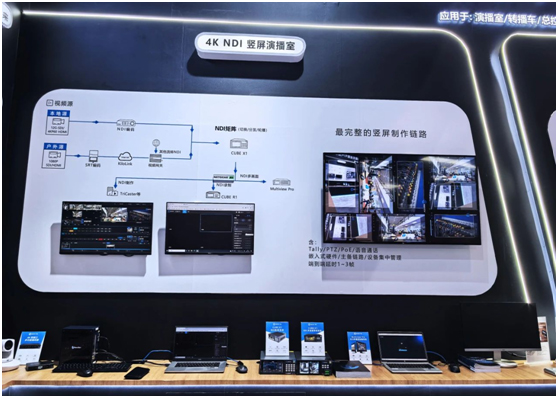 千视在本次展会上重点推出了基于NDI技术的竖屏节目制作方案。该方案打破了传统输入格式的限制(无论是16:9还是9:16),灵活支持横拍与竖拍信号源,并通过NDI IP网络高效传输。后端配备的NDI矩阵分发、导播切换、多画面监看及字幕制作包装系统,全面兼容横竖屏场景,无缝对接各大主流直播平台。尤为值得一提的是,千视在全球热卖的旗舰产品——CUBE XI NDI矩阵系统与CUBE R1 NDI多通道录制系统。CUBE XI以其卓越的NDI信号流分发能力,实现了对信号的统一调度、切换和分发管理;而CUBE R1则通过多通道同步录制(4路4KP60视频/9路1080P60视频),确保了每一帧画面的精准捕捉与高质量存储,两者协同工作,共同助力用户构建专业级、高效率的竖屏演播室。