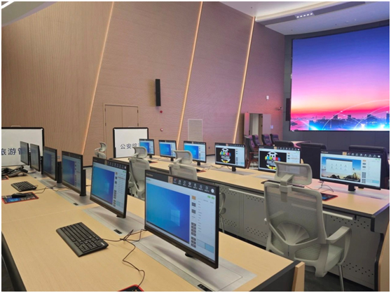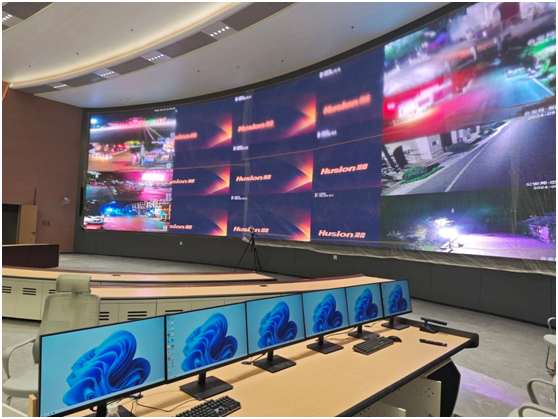 小间距LED显示屏,具备广阔的视角覆盖范围,能够实现快速动态画面的无延迟刷新。本次智算中心引进了小间距LED曲面屏,该屏幕能够智能调节亮度,自动适应周围环境,提供细腻且高清晰度的画面,满足超高清视频播放的需求。它支持多画面显示,使得数据信息一目了然,通过“一块大屏”即可实时监控区域运行状况、协同处理跨域业务,并为决策指挥提供支持。