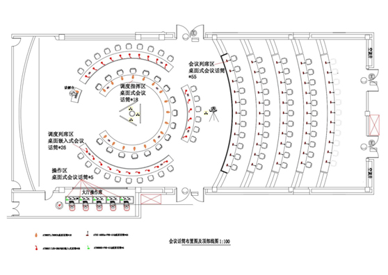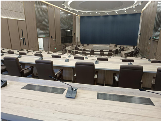本次项目的重点在于会议系统使用2台ATUC-50CU主机配置98只话筒,将整个大厅划分为3个区域。全部话筒连接均使用环形链接方式确保整个系统稳定运行。全部2.4G无线话筒均采用天线与机架分离的形式进行布线,做到了整个大厅无线覆盖无死角。