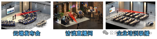 云端发布会:主持人在讲解时,VTRX系统可智能追踪并切换场景全景、主持人全身、近身或特写画面,并可通过智能构图展示实际产品的真实面貌;亦可实现精彩的多人讲解场面,完成丰富多样化的发布会视频制作。