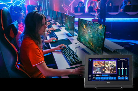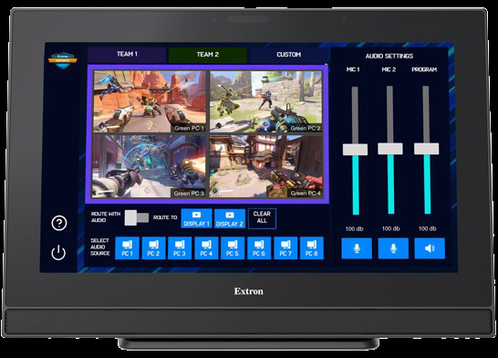 Esports CompKit 配备的专属用户界面可显著提升赛事及活动制作效率。您通过 Extron 触摸屏即可轻松地管理和操作 AV 设备,包括在团队画面和选手特写,以及 PC 和摄像机信号源之间快速切换选择,并传输至场内显示设备或直播平台。赛事进程中,您也可随时调节音频参数,以构建更具动态感的音频体验。与此同时,解说员、分析师和教练员可在屏幕上实时圈画关键区域,以强调重要时刻。简言之,用户友好的界面可让您轻松高效地管理系统各项功能的稳定运行。