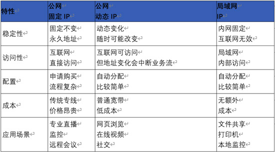 为什么需要公网固定IP?其核心优势在于稳定性和可访问性。以下是三种IP类型的详细对比: